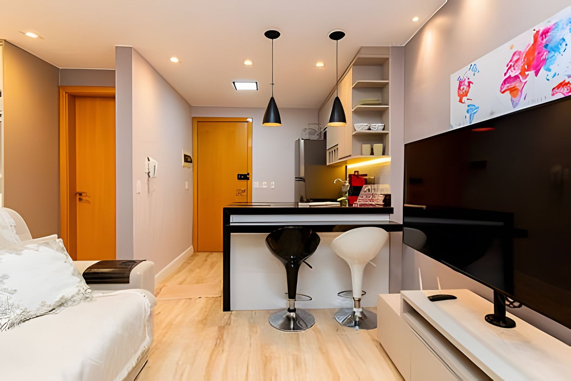 O espaço possui uma cama de casal e sofa cama. Guarda roupa espaçoso, uma mesa de estudo ou trabalho com vista. Uma cozinha completa.