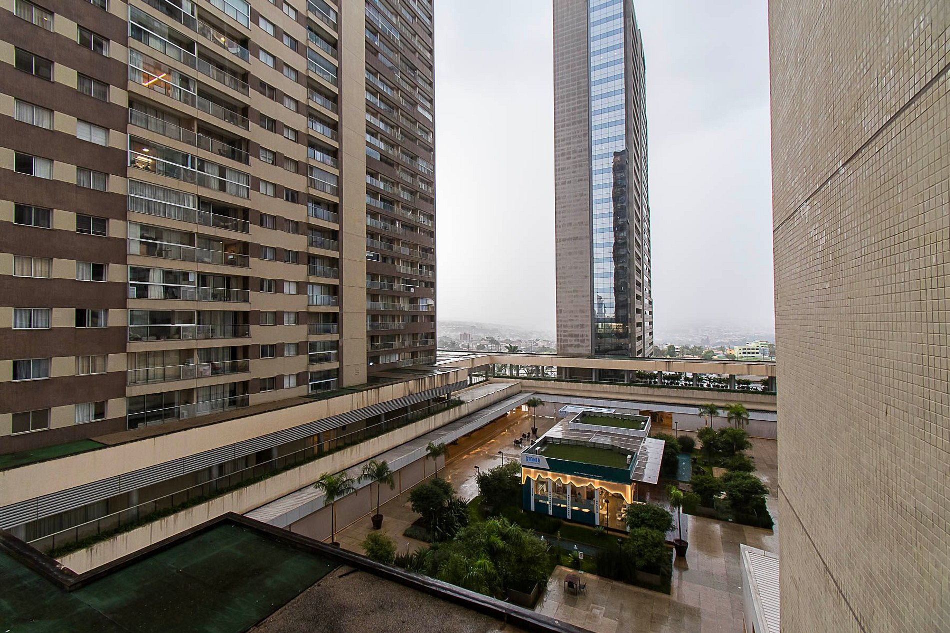O prédio fica dentro de um complexo com shopping e mercado.
