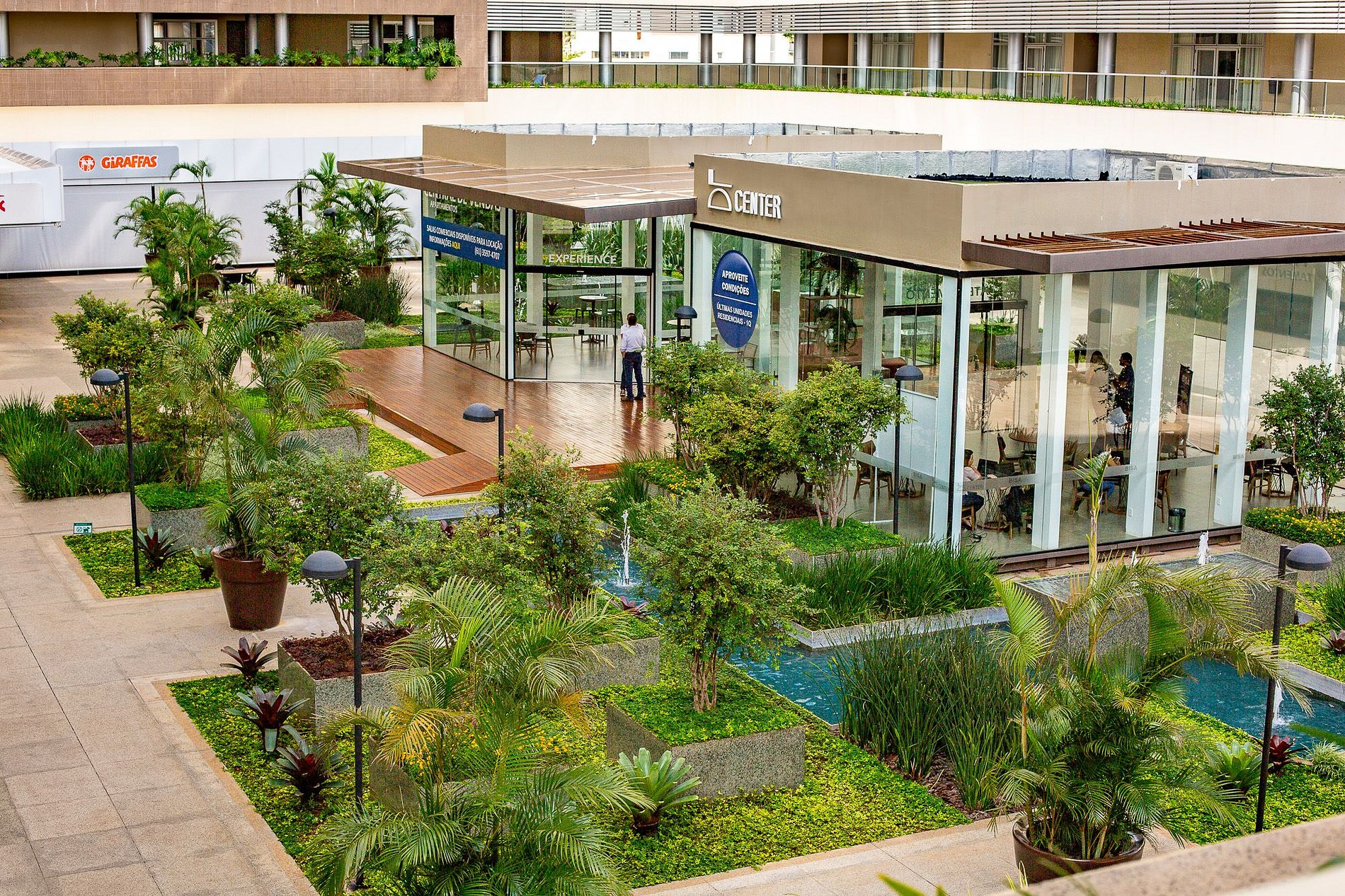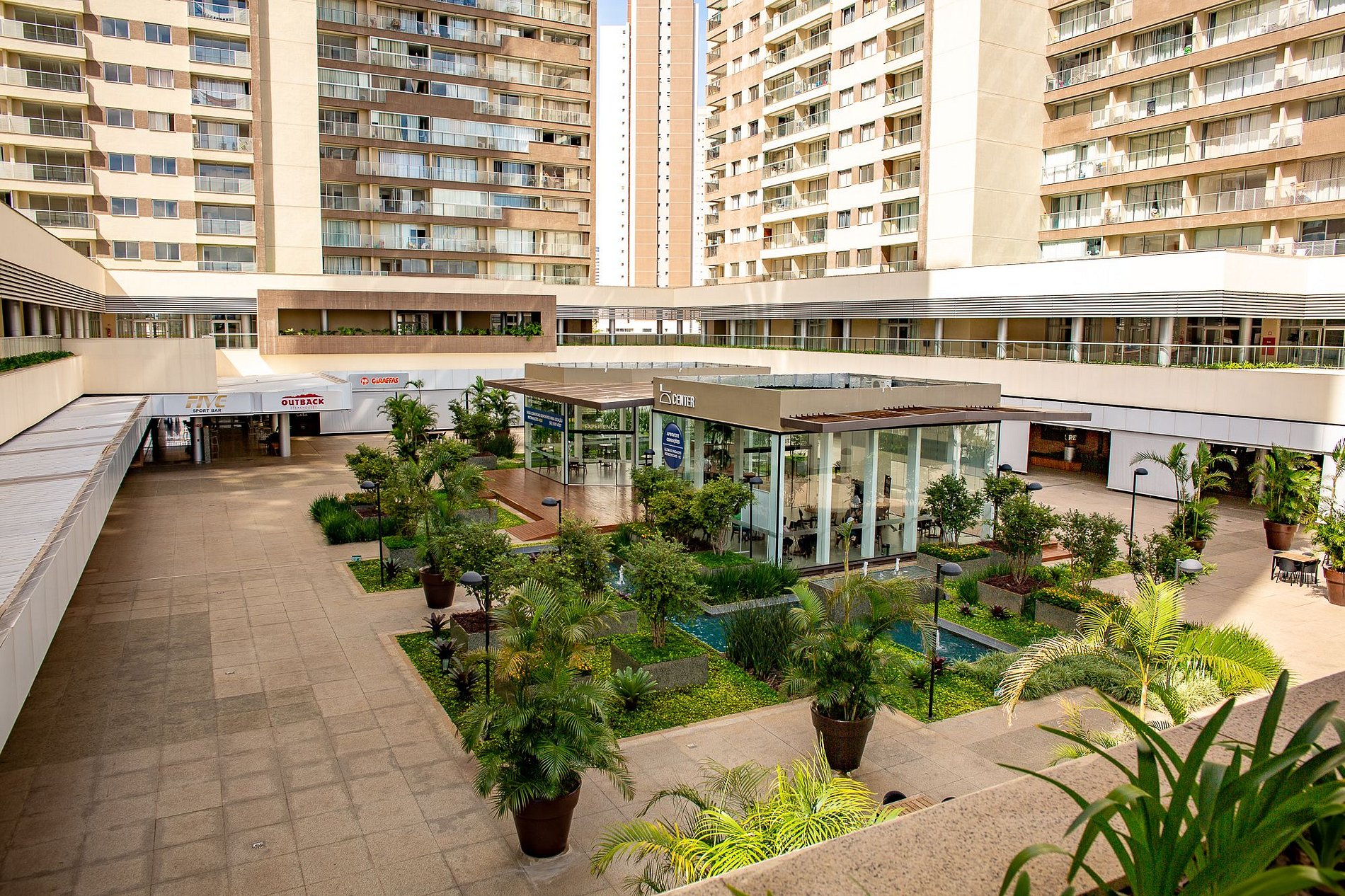 O prédio fica dentro de um complexo com shopping e mercado.