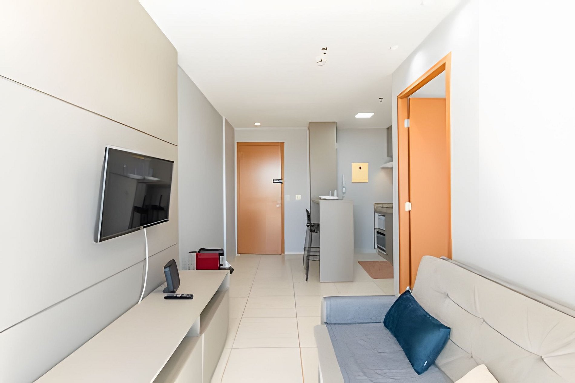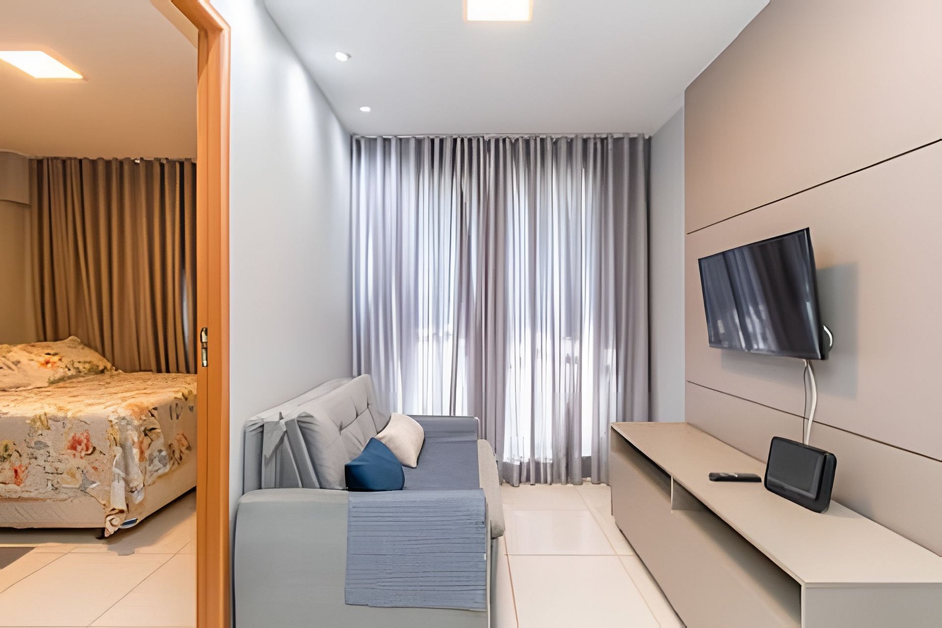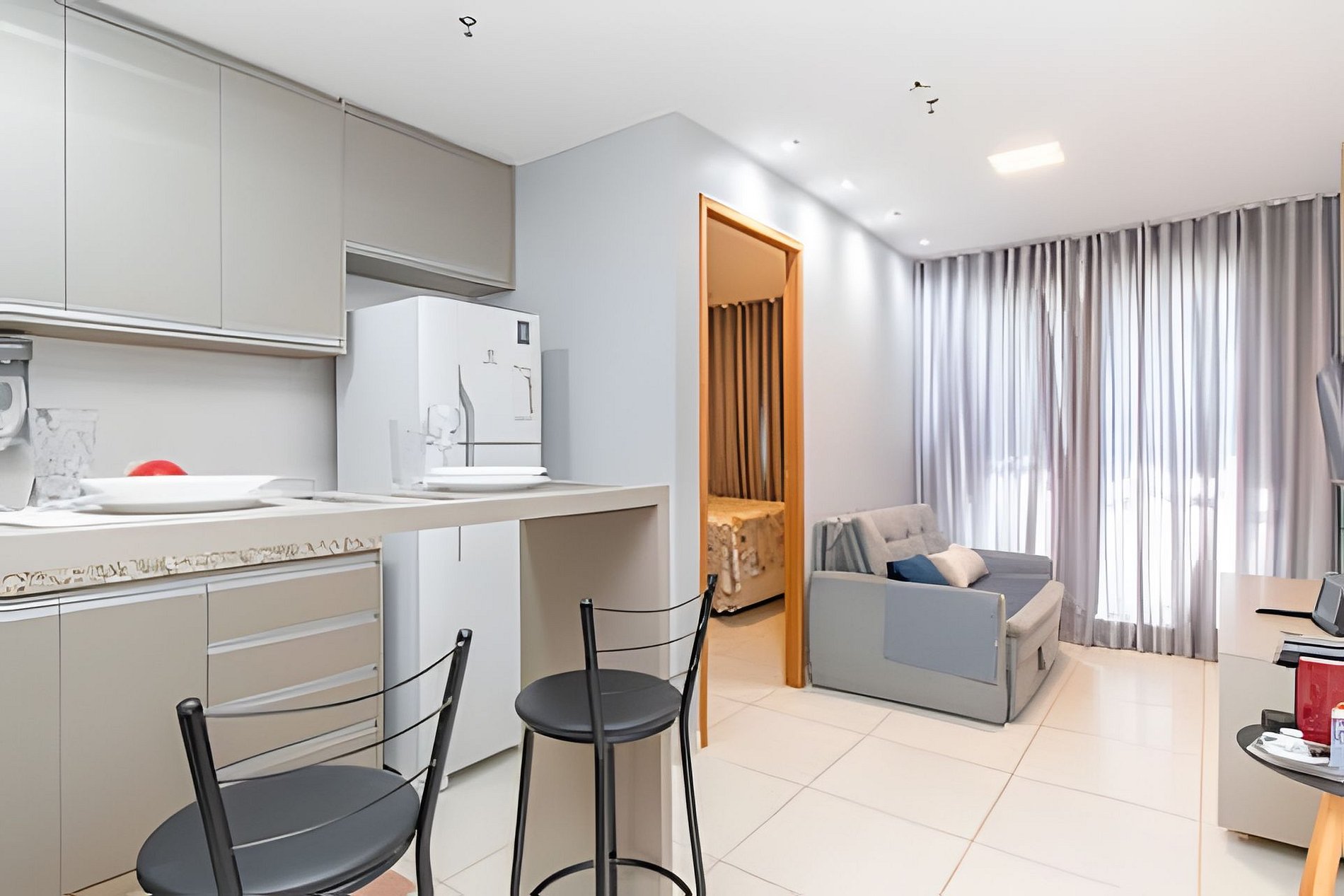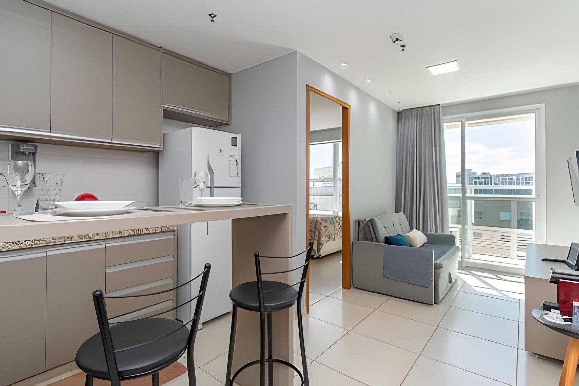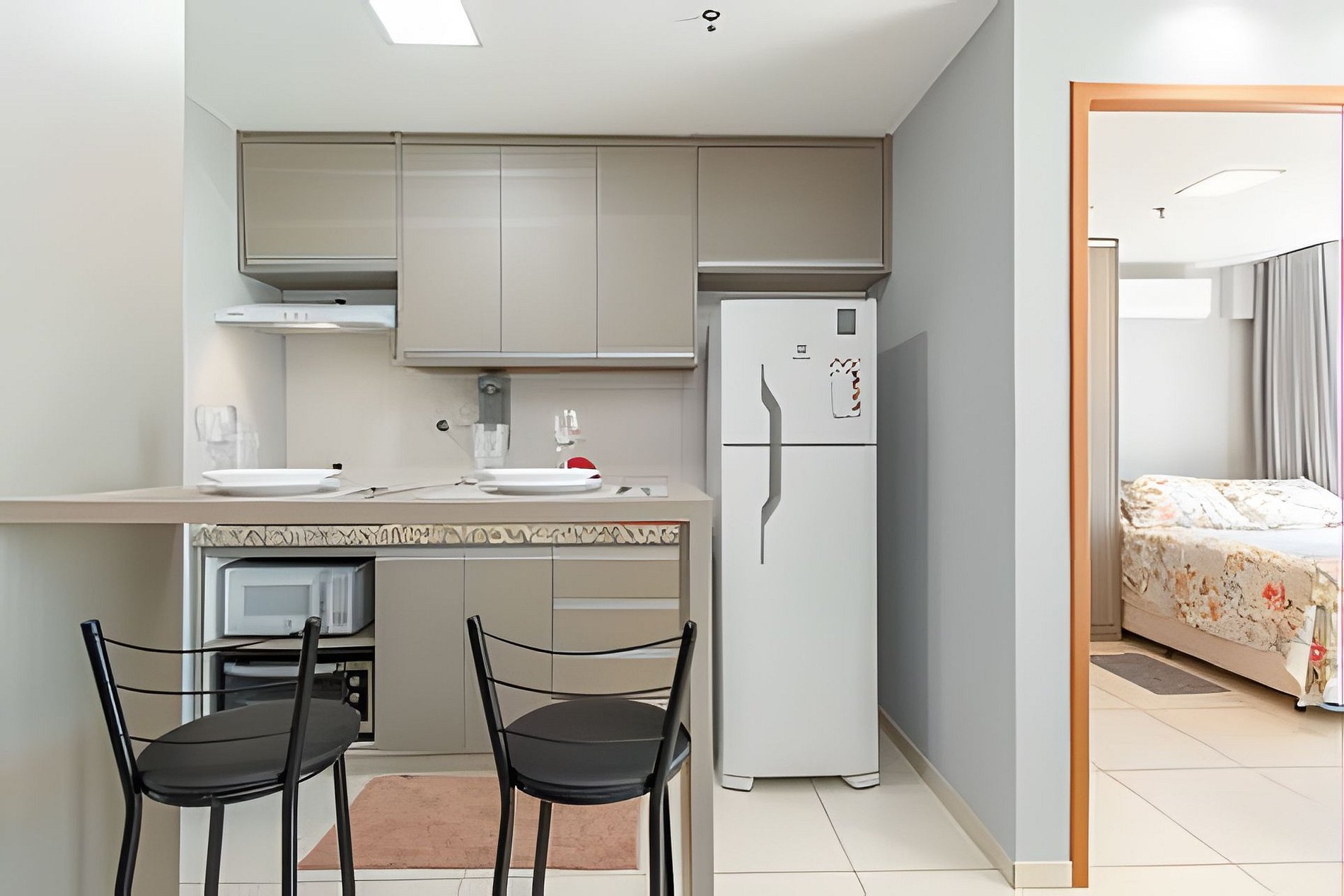 Apartamento ideal para um casal, com uma cama de casal extremamente confortável, ar condicionado no quarto e uma internet veloz.